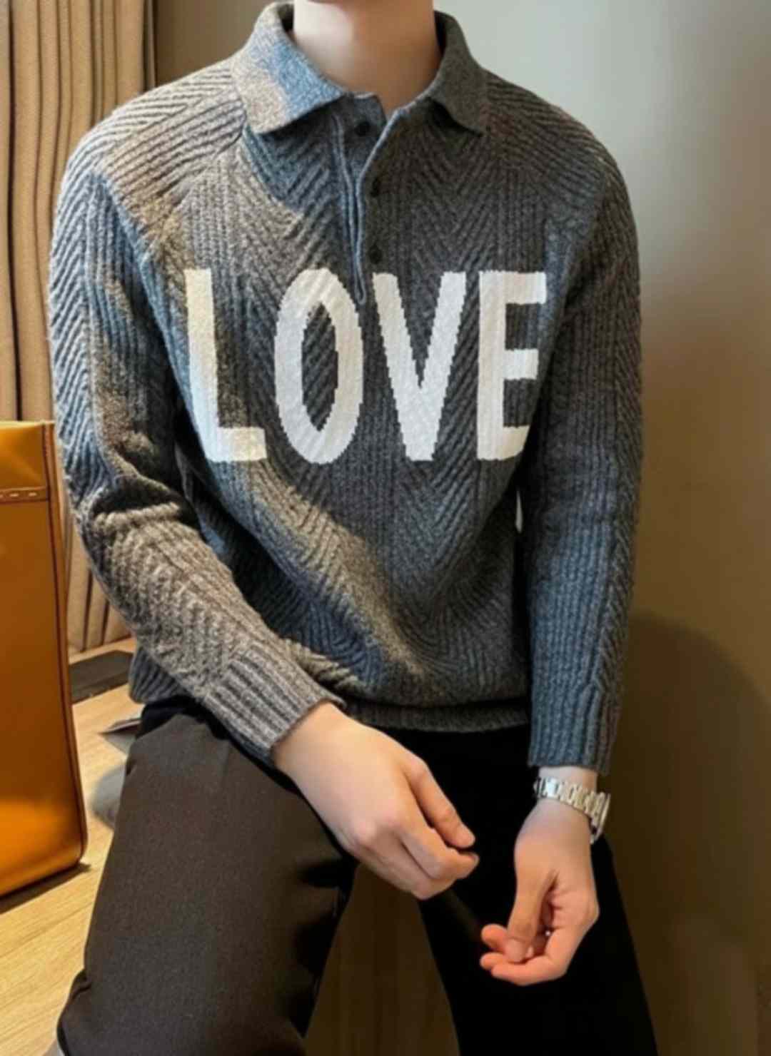 Grey striped pullover featuring a classic shirt collar,