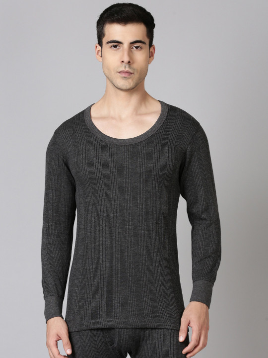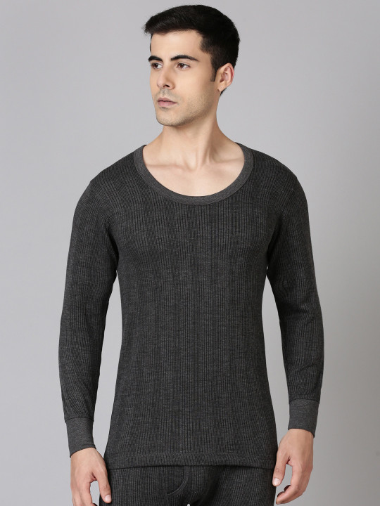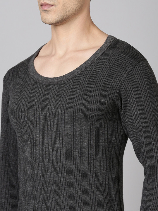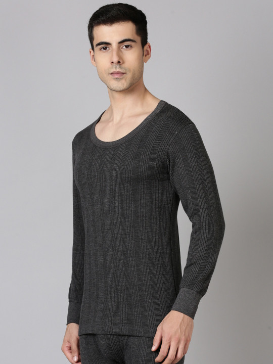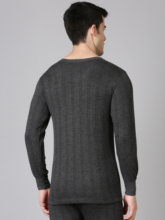 Dark grey melange ribbed thermal top featuring a round neck, long sleeves and cuffed hems. Designed for warmth, flexibility, and all-day comfort in cold conditions.