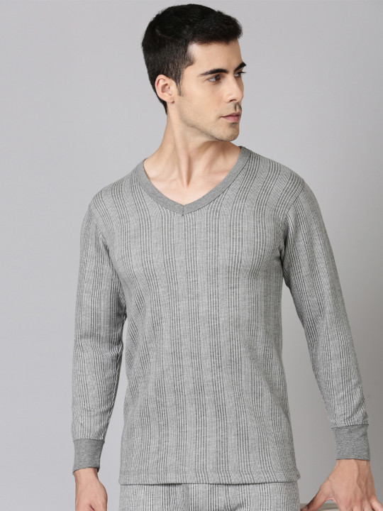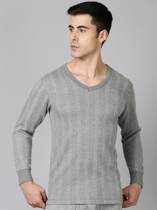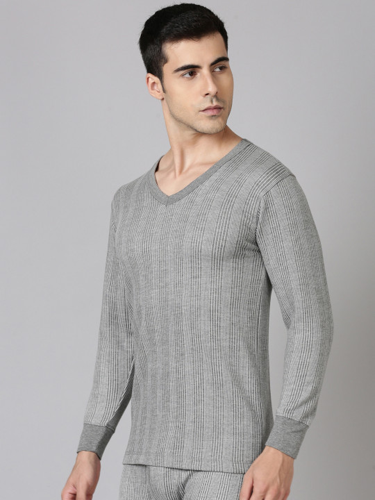 Grey melange ribbed thermal top featuring a V-neck, long sleeves and cuffed hems. Designed to provide warmth, flexibility and superior comfort during cold weather.