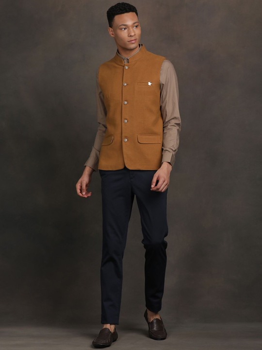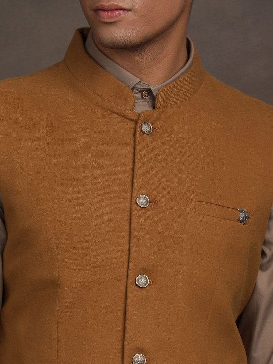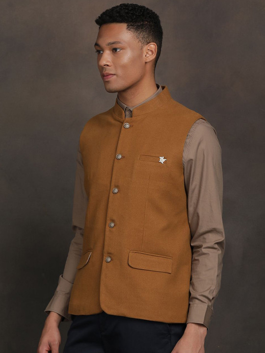 Brown velvet Nehru jacket designed in a slim-fit silhouette. Features a mandarin collar, full button placket, sleeveless design and three pockets, making it perfect for festive and formal occasions.